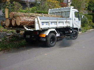 切り倒したヒノキを4トンダンプにきっちり積み、