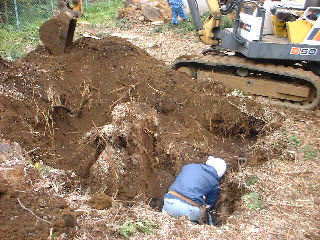 ユンボでまわりから崩して行き、穴に潜ってチェーンソーで根を切る。