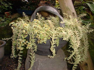 グングン伸びたセダムが瓦の鉢からあふれて爆発