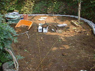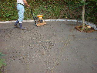 | 芝と草を剥がし周りにU字溝をいれる。 | 砕石を入れて転圧する。 | 舗装材を均し完成。明るく広く感じます。 |