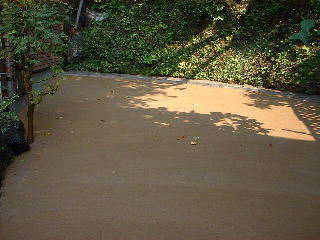 日陰で芝が育たないスペース。雑草防止とワンちゃんのために、土系の舗装をすることになった。